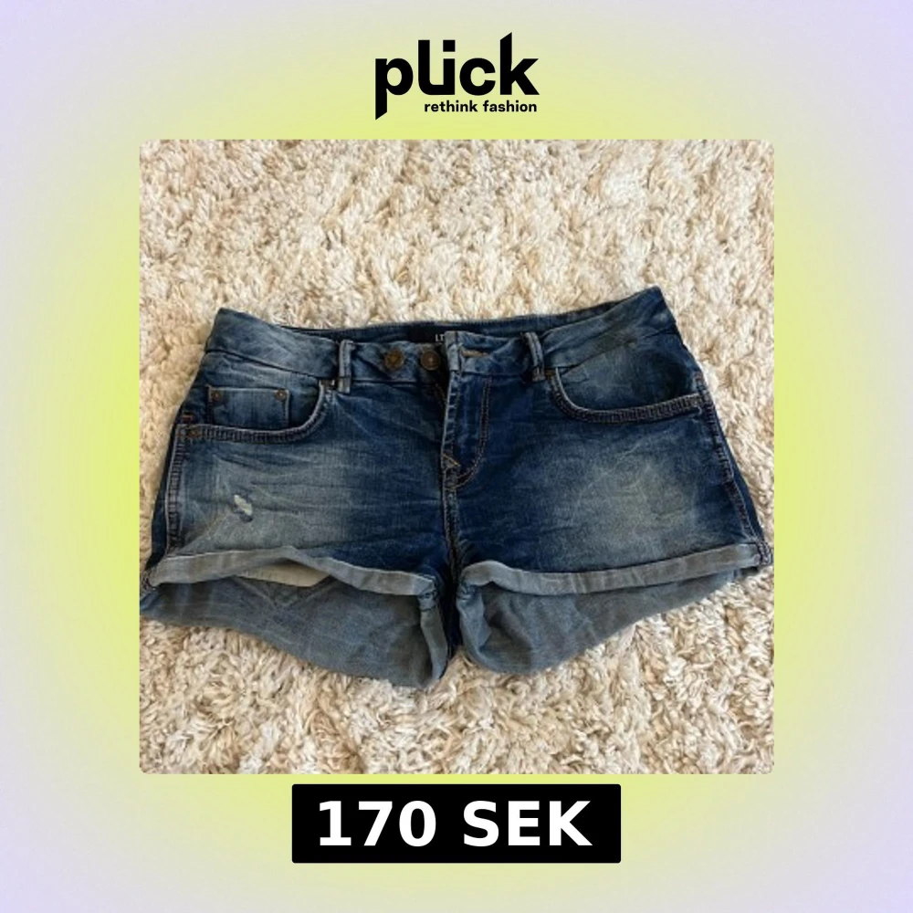 Snygga blå lågmidjade jeansshorts från LTB med slitna detaljer och uppvikta kanter. De har en klassisk femficksdesign och knappgylf. Perfekta för en avslappnad stil.