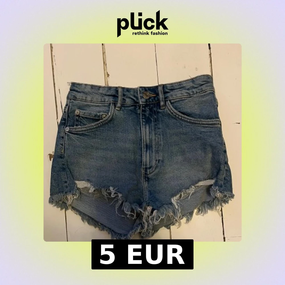 Säljer ett par snygga blå jeansshorts med fransiga kanter. De har en klassisk femficksdesign och knappgylf. Perfekta för en avslappnad stil.