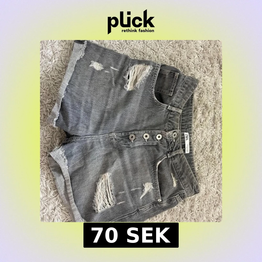 Säljer ett par grå jeansshorts från Zara med flera slitningar och råa kanter. Shortsen har knappar framtill och klassiska fickor både fram och bak. Storlek 38