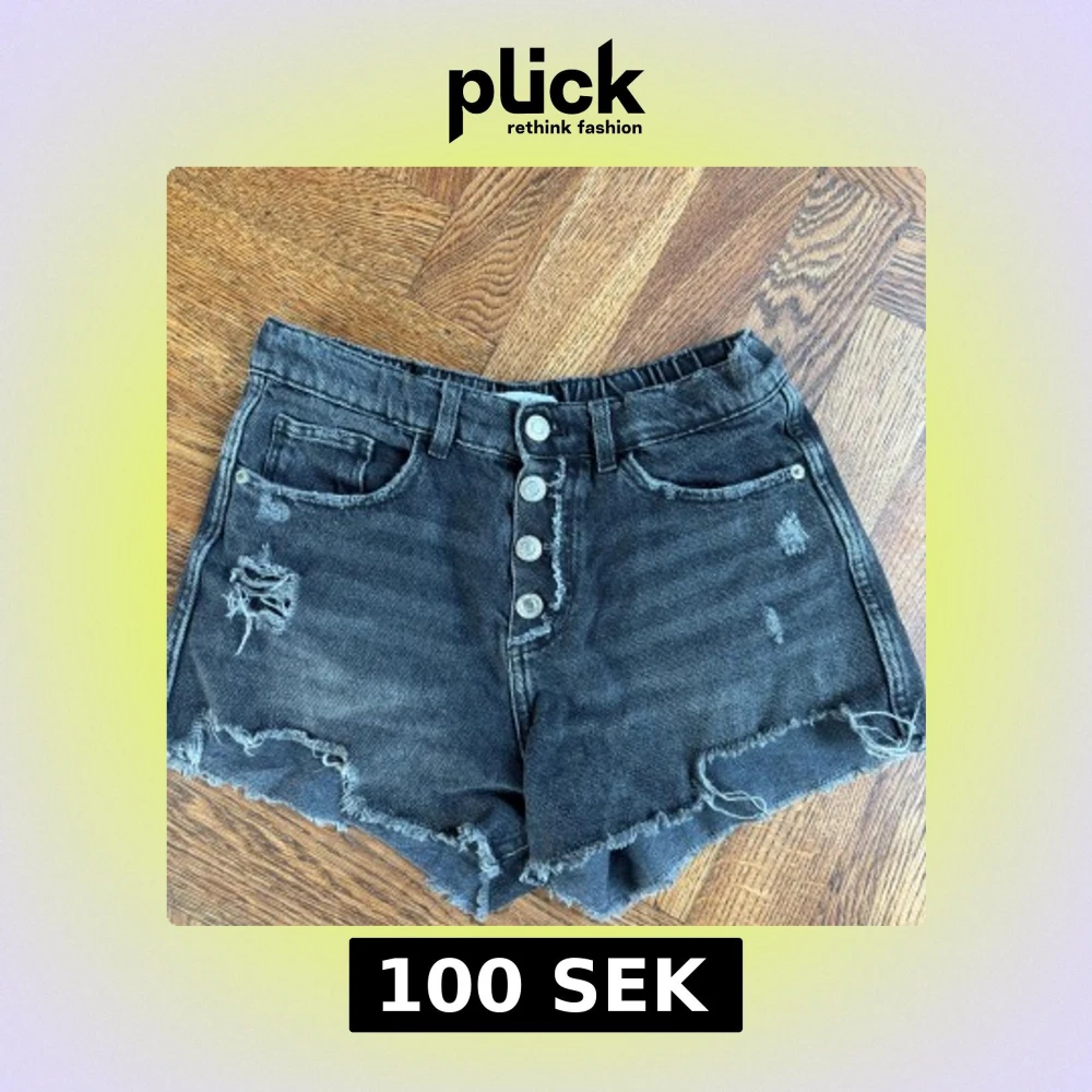 Snygga svartgråa jeansshorts från Zara med slitna detaljer, fransig kant och knappar framtill. Shortsen har klassisk femficksdesign och hög midja. Perfekta för en avslappnad stil. Storlek 164 men sitter som xs