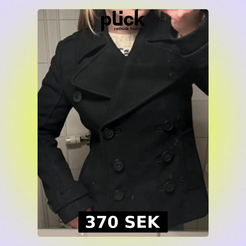 Stilren svart skepparkavaj med bred krage och klassisk dubbelknäppning framtill. Jackan har dekorativa axelklaffar och knappar vid ärmsluten. Materialet ser ut att vara ullblandning, vilket ger en snygg och tidlös look. Perfekt för dig som gillar klassiska plagg med modern touch.
