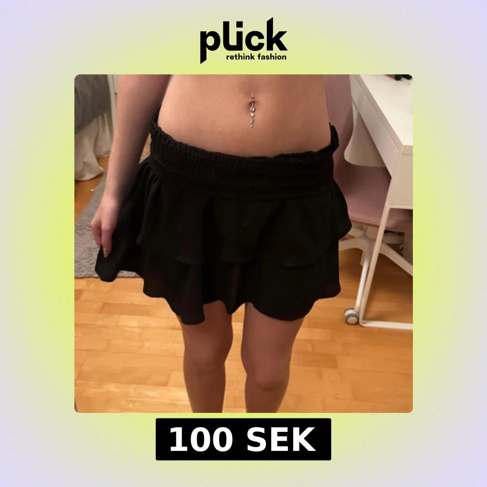 Supersöt svart kortkjol med bred smock i midjan och dubbla volanger. Kjolen har en flowy känsla och sitter bekvämt tack vare den elastiska midjan. Perfekt att styla med crop tops eller hoodies. Materialet känns lätt och luftigt.