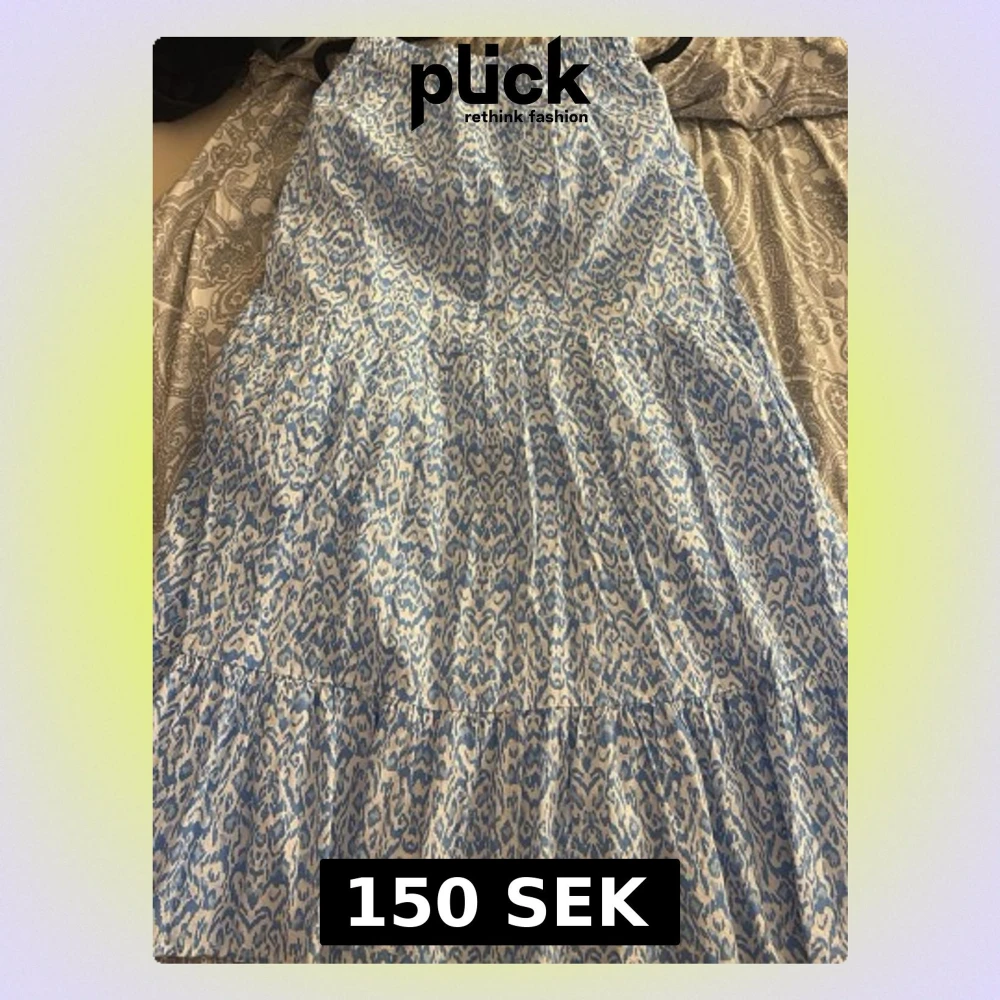 Säljer en blåvit långkjol med leopardmönster. Kjolen har en luftig och avslappnad passform med resår i midjan och volangdetaljer. Använd 1 gång.