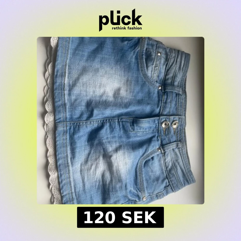 Söt ljusblå jeanskjol med två knappar framtill, klassiska fickor och en vit spetskant längst ner.