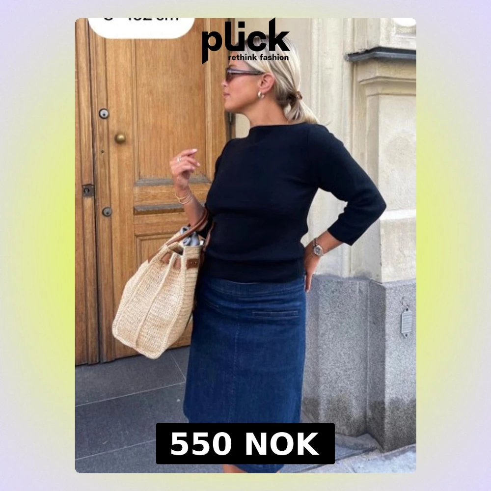 Säljer en mörkblå jeanskjol med rak passform och klassisk design. Kjolen har en enkel stil utan mönster och är tillverkad i denim, vilket gör den både snygg och enkel att matcha med olika toppar.
