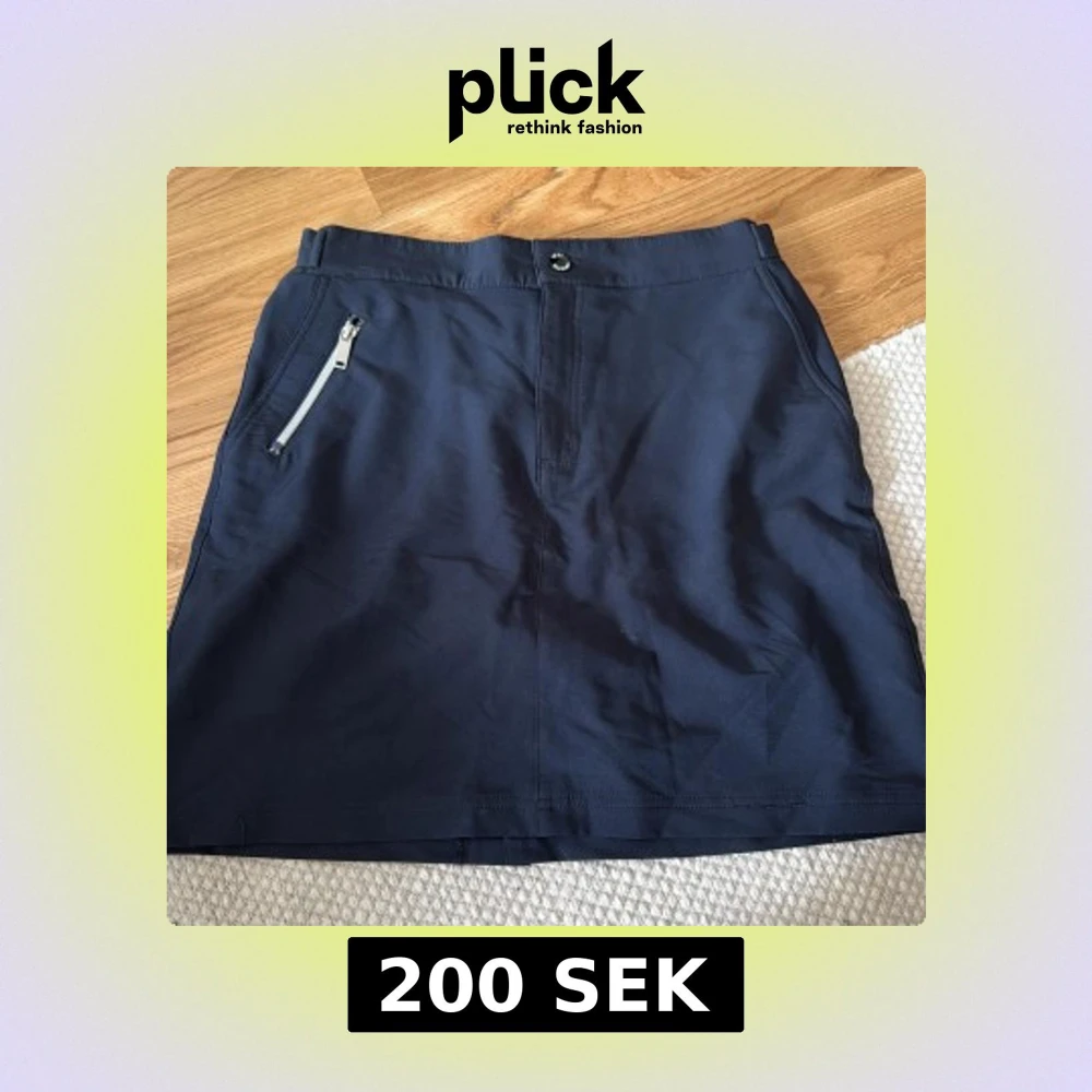Snygg mörkblå kortkjol från Lundhags med stilren design. Kjolen har en praktisk dragkedja fram och knappstängning i midjan. Materialet känns slitstarkt och passar perfekt till utomhusaktiviteter. Enkelt att matcha med sneakers eller boots. Aldrig använd