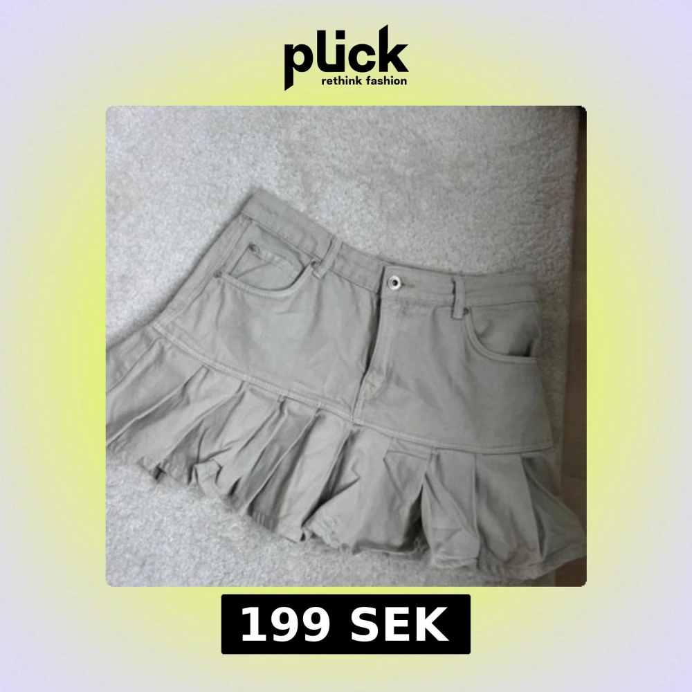 Superfin beige kortkjol med volangkant och klassiska jeansdetaljer som fickor och bälteshällor. Kjolen har en avslappnad vibe och passar perfekt till sneakers eller boots. Materialet känns som bomull och ger en cool, casual känsla.