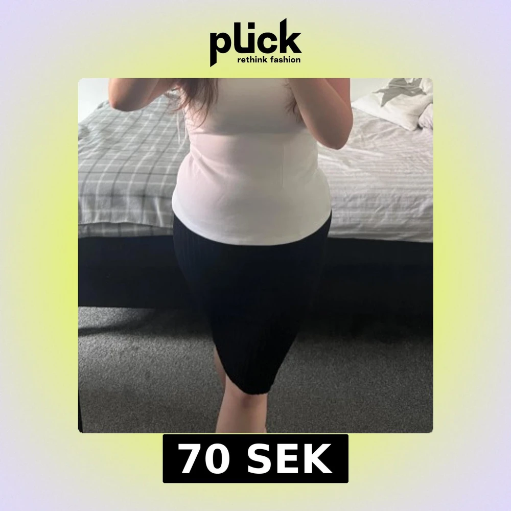 Säljer en svart ribbad kjol med tight passform och stretchigt material. Kjolens längd kan justeras, den kan sitta längre eller kortare (beroende på vad man önskar).