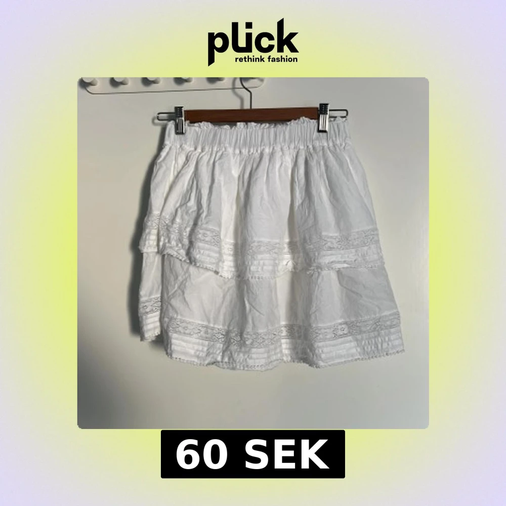 Superfin vit kortkjol från Bik Bok i bomull med bred resår i midjan. Kjolen har flera lager med volanger och spetsdetaljer som ger en romantisk och somrig vibe. Perfekt att styla med en enkel topp eller stickad tröja. Om du köper denna tillsammans med den förra annonsen får du båda för 80kr!