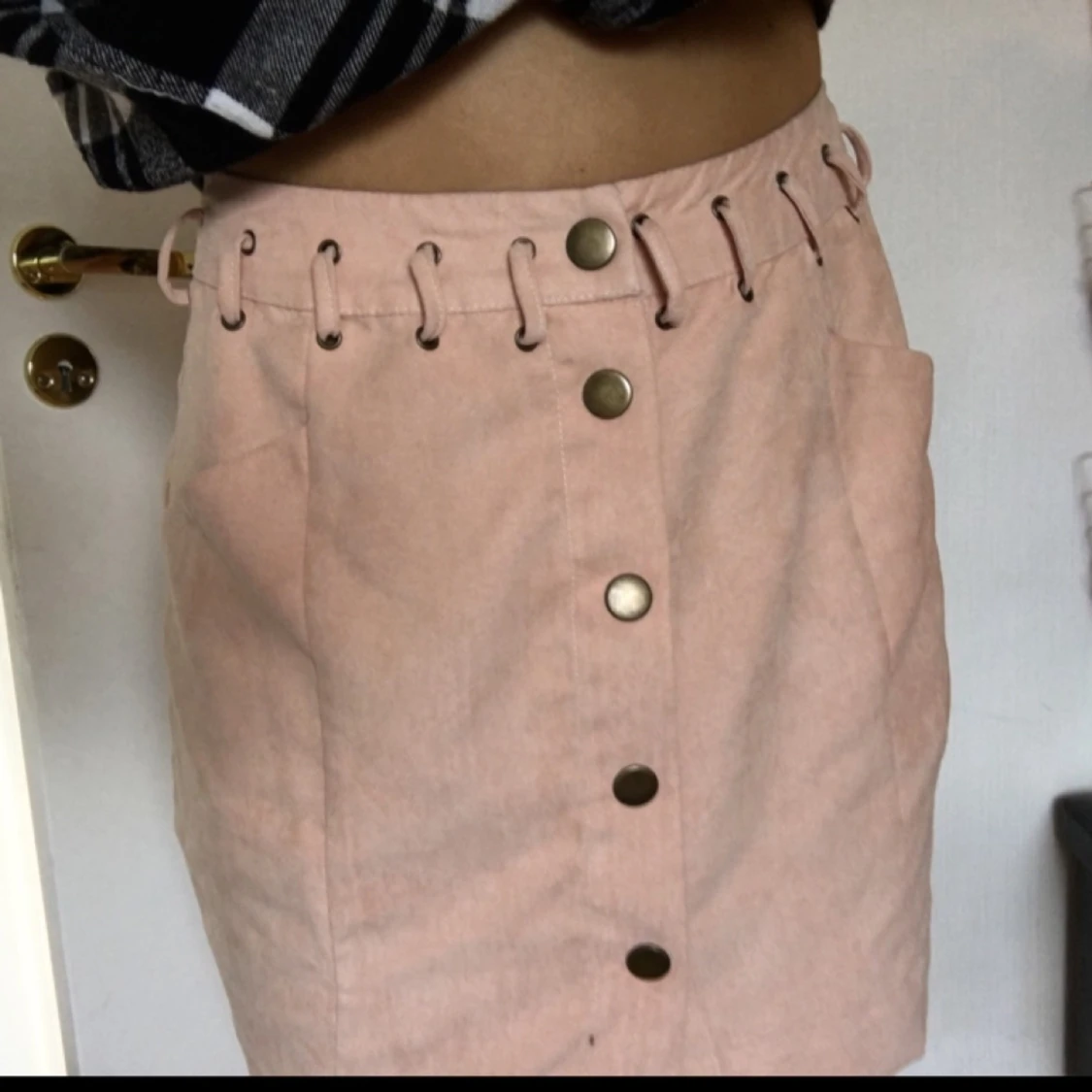 Ljusrosa kjol i fejkmocka! Brons/guldig knäppning fram och knytdetaljer vid midjan fram. Den är uppsydd och något insydd men fortfarande stl 36 och för stor för mig. Omsyningen går att sprätta. Kan fraktas då köparen står för kostnaden!