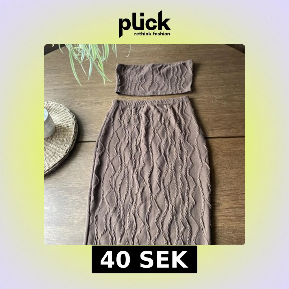 Brun, figurnära kjol och topp från SHEIN med ribbat, vågigt mönster. Kjolen är midilång och har en mjuk, stretchig känsla. Perfekt att matcha med den medföljande tubtoppen för en snygg look.