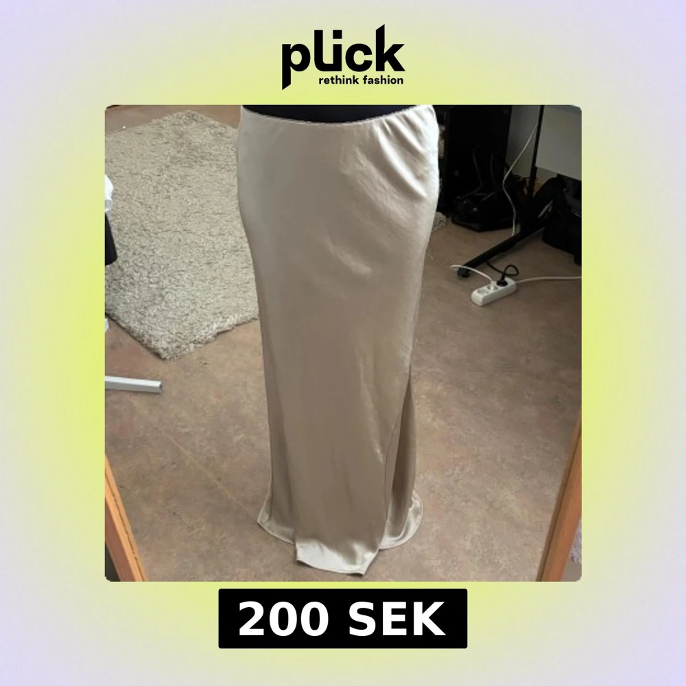 Supersnygg långkjol i beige satin-look med slits på sidan. Kjolen har en figurnära passform och skimrande yta som ger en lyxig känsla. Perfekt för dig som gillar stilrena och eleganta plagg med lite edge. Har sömm som har lossnat som man kan se på bild 3 o 4
