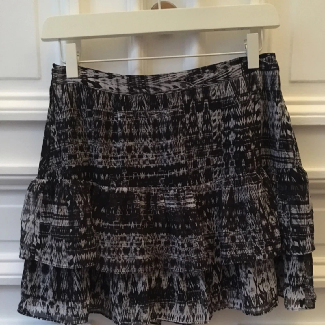 Kort mönstrad kjol i svart/vitt med volanger. Dragkedja i sidan. Fodrad. Storlek 36