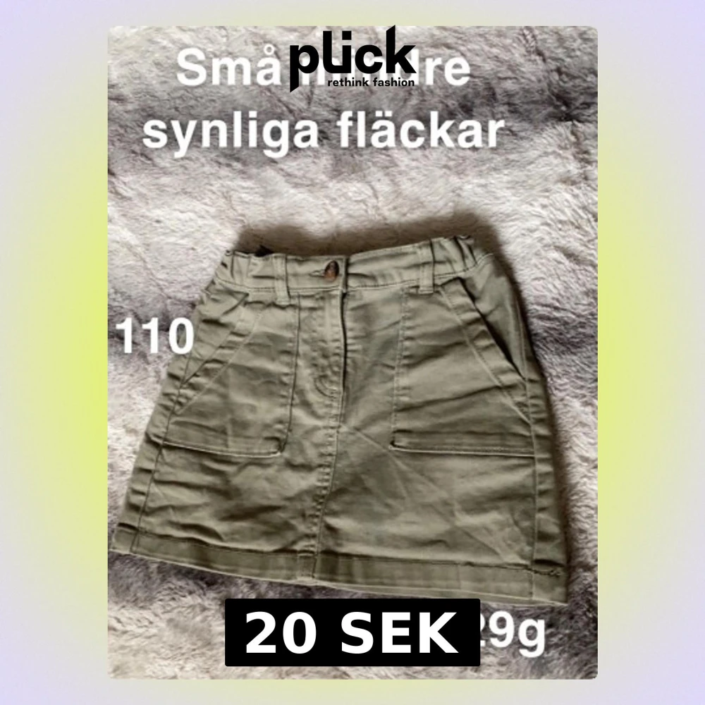 Snygg grön kjol med stora fickor framtill och bälteshällor i midjan. Kjolen har en knapp och dragkedja framtill. Perfekt för en avslappnad och cool stil.🌸 Små mindre synliga fläckar. Storlek 110