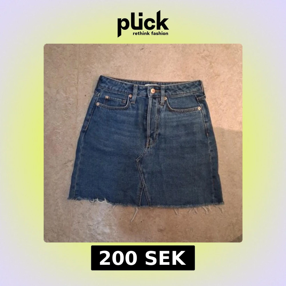 Snygg jeanskjol från H&M i klassisk blå denim. Kjolen har en rå kant nertill och femficksdesign med knapp och dragkedja framtill.