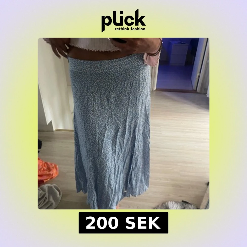 Supersöt långkjol från H&M i ljusblått med små vita och gula blommor över hela tyget. Kjolen har en flowy passform och är gjord i mjuk bomull, perfekt för varma dagar. Sitter snyggt i midjan och ger en chill och somrig vibe. Strl 42 men jag har vanligtvis 34-36