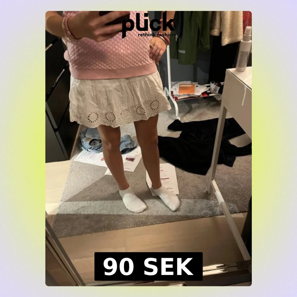 Supersöt vit kort kjol med volang och broderade blommor längs nederkanten. Kjolen har en luftig passform och är gjord i bomull, perfekt för varma dagar. Elastisk midja för extra komfort och snygg passform. Pris kan diskuteras