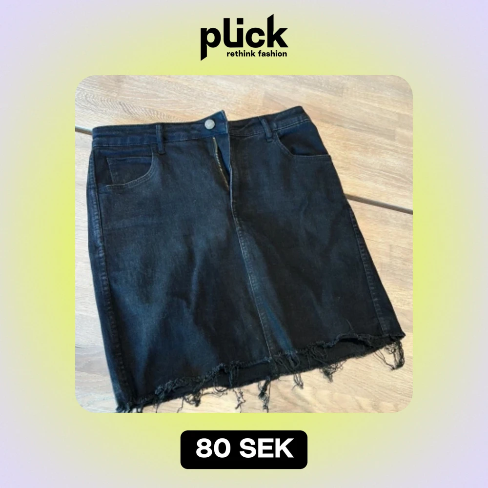 En välanvänd jeanskjol men som är i fint skick. Fickor fram och back. Lite slitet längst ner, så ska det vara. Djur finns i hemmet