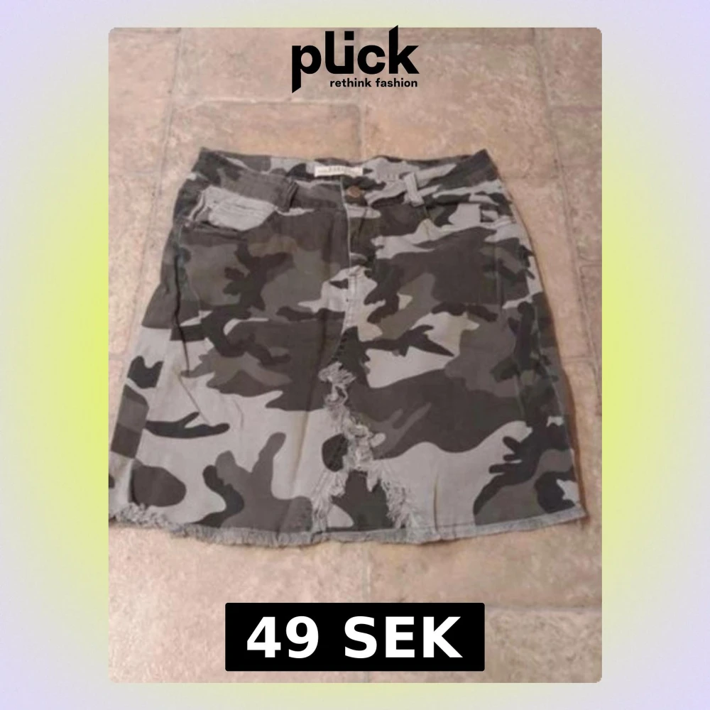 Säljer en cool kortkjol i camouflage-mönster med fransad kant och slitningar framtill. Kjolen har fickor och bälteshällor, perfekt för dig som gillar streetstyle och vill sticka ut lite extra.