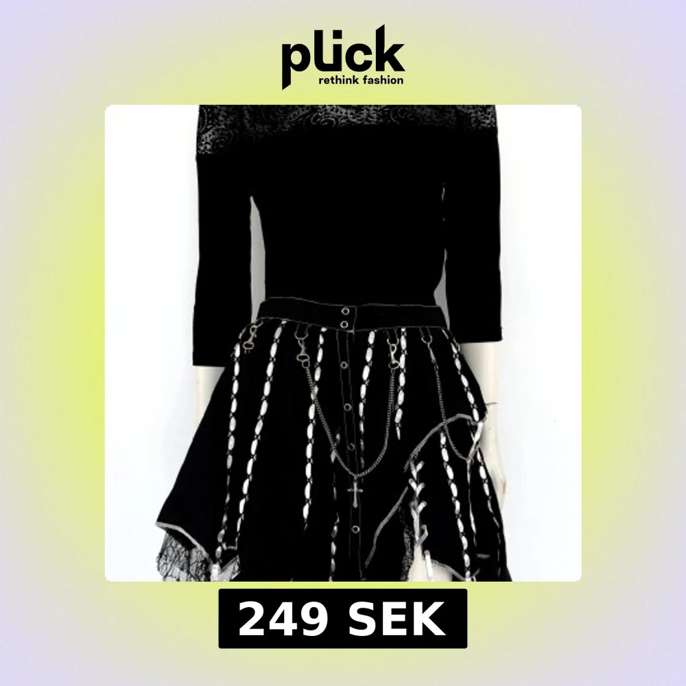 Trendig svart kjol med spetsdetaljer upptill och kedjor som hänger från midjan. Kjolen har ett unikt mönster med vita ränder och en asymmetrisk kant med spets. Perfekt för en edgy look. Storlek M. Helt ny.