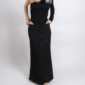 En svart långkjol i kostym material. Kjolen är omdesignad från ett par kostymbyxor till en kjol. Modellen på bilden är 170 cm och bär stl S/M. Passar både större som mindre beroende på önskad passform. Storlek: M/L