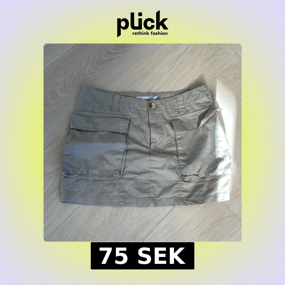 Säljer en beige kortkjol från 157 med stora praktiska fickor framtill. Kjolen har en knapp och dragkedja i midjan samt hällor för bälte. Perfekt för en avslappnad stil.