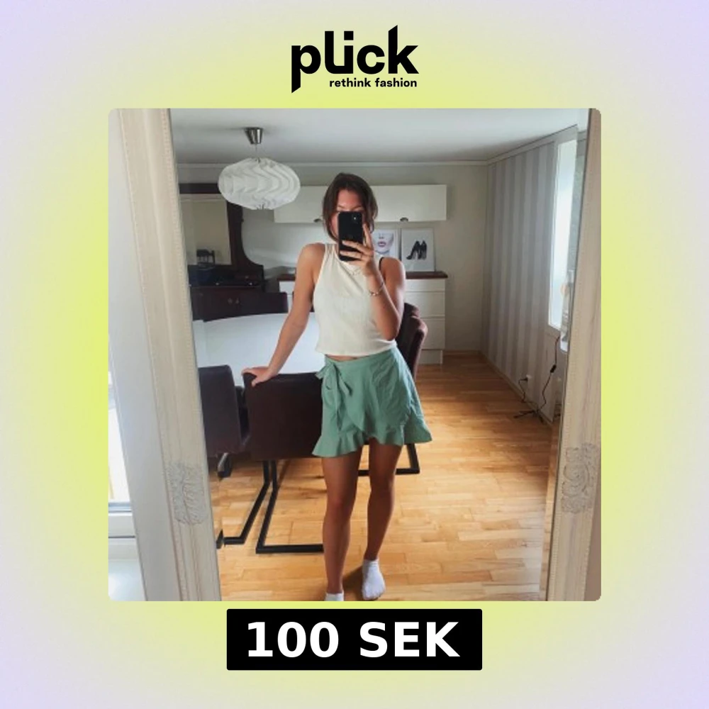 Snygg ljusgrön kort omlottkjol med volangkant och knyt i midjan. Kjolen har en luftig och somrig känsla, perfekt för varma dagar. Enkel att matcha med olika toppar för en fräsch look.