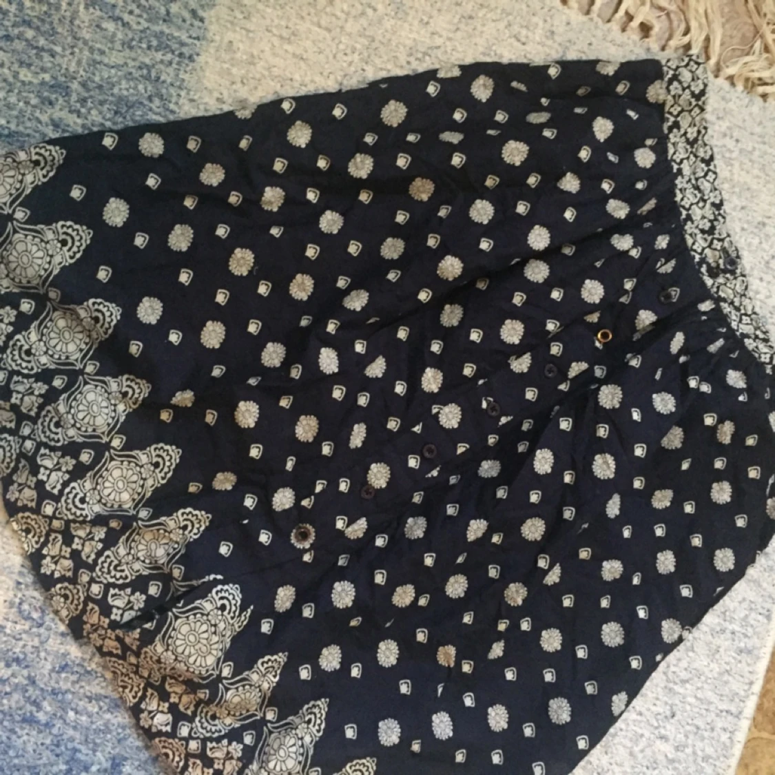 Knälång kjol med knäppning på framsidan hela vägen, ingen storleksmärkning men skulle tro att det är en small.