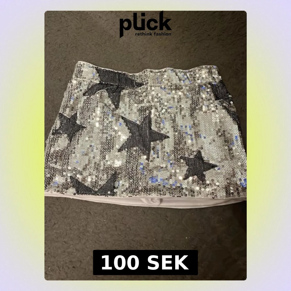 Kort kjol täckt av silvriga paljetter och stora svarta stjärnor. Kjolen har en elastisk midja och är fodrad med vitt tyg för extra komfort. Perfekt för dig som vill sticka ut och glänsa lite extra.