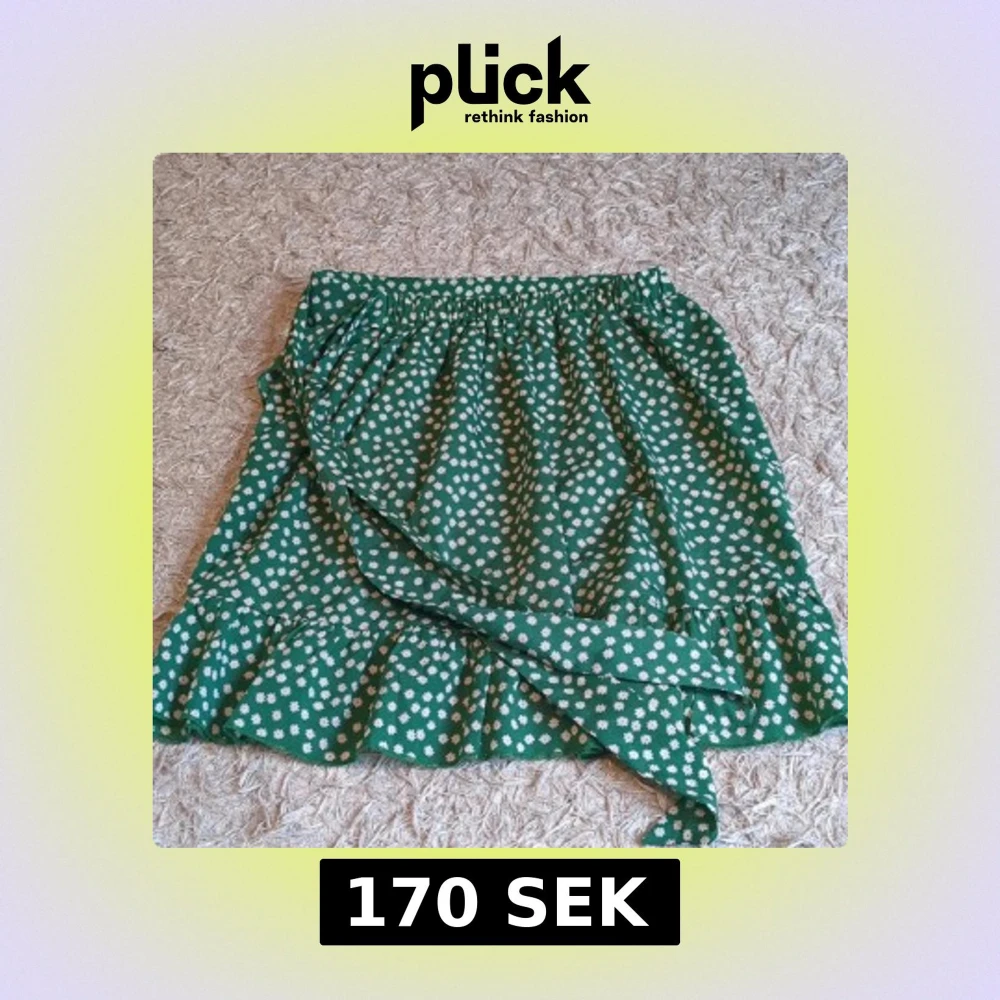 Supersöt grön kortkjol med vita blommor, omlottmodell och volangkant. Kjolen har knytband i midjan och är perfekt för sommarens alla äventyr. Lätt och luftig känsla, passar perfekt till sneakers eller sandaler.