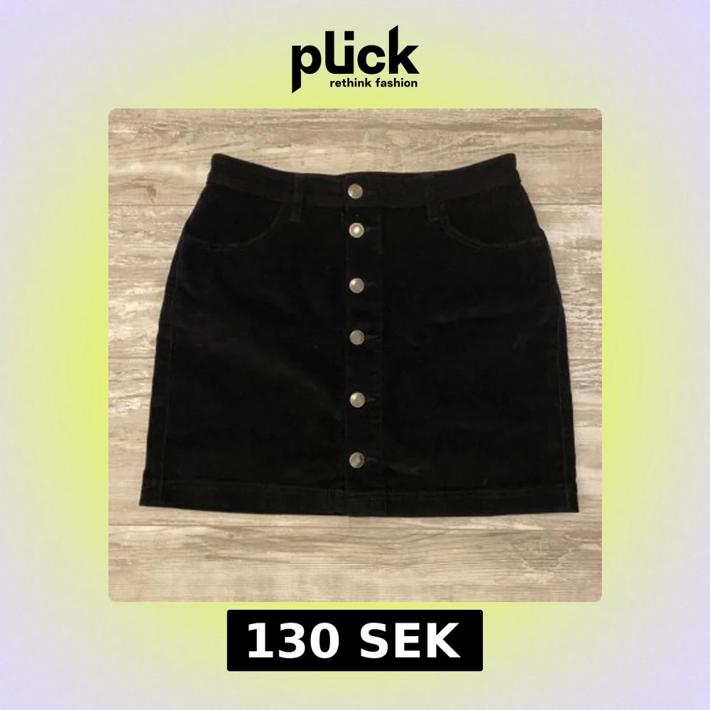Snygg svart kortkjol med fickor fram och hällor för bälte, perfekt för en cool och enkel stil. Kjolen är i storlek 10 och passar som storlek S