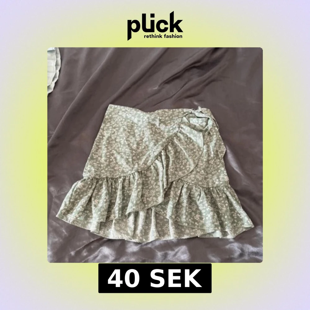 Supersöt kort kjol i ljusgrönt med vitt blommönster. Kjolen har omlottmodell med knyt i sidan och volang längs nederkanten för en extra feminin touch. Perfekt för varma dagar och ger en romantisk vibe till din outfit.