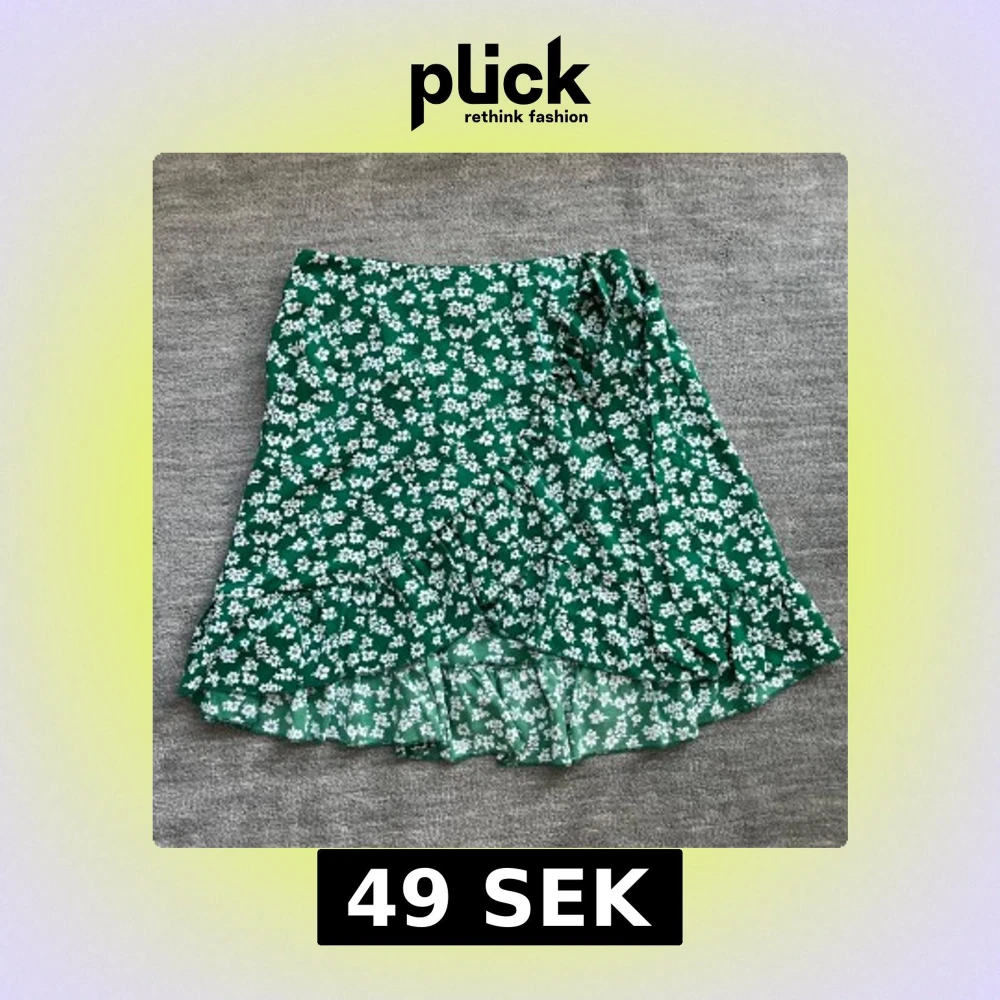Säljer nu denna gröna volangkjol med vitt blommönster på. Kjolen har två band som man kan knyta till en rosett. Kjolen köptes för 120 kr men säljer den nu för 49 kr. Endast använd 1 gång!