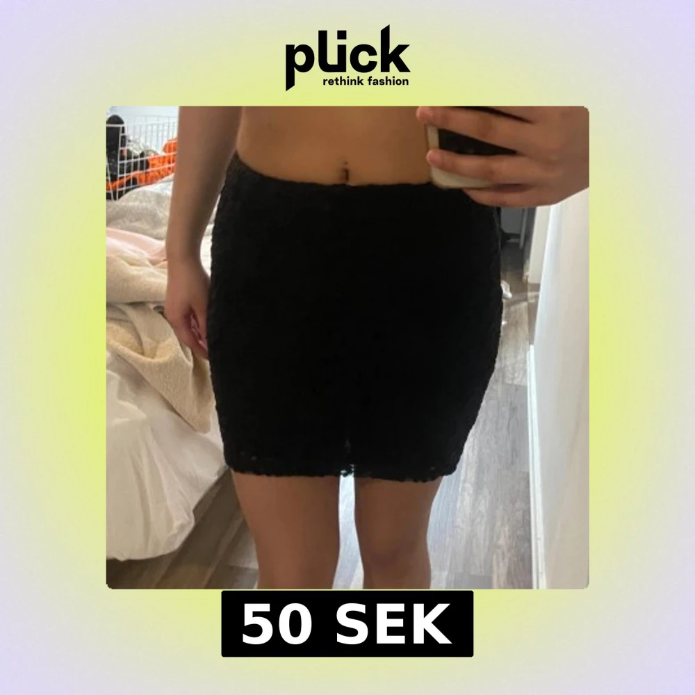 Säljer en svart kortkjol i spets med figurnära passform. Kjolen har en enkel design utan synliga detaljer och är perfekt för dig som gillar en stilren look. Passar till många olika outfits och är lätt att matcha.