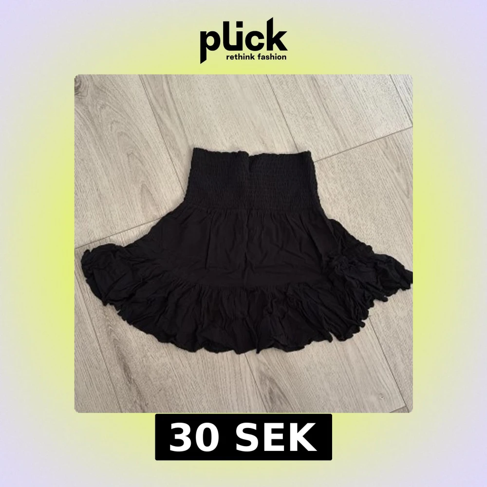 Supersöt svart kortkjol med bred smock i midjan och volangkant nertill. Kjolen har en flowy känsla och passar perfekt till sneakers eller boots. Enkel att styla och riktigt skön att bära.