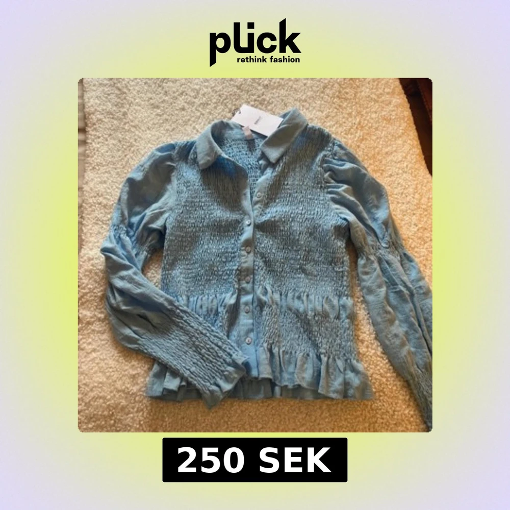 Säljer en snygg blå blus från ONLY med smockdetaljer och knappar framtill. Blusen har långa ärmar och en klassisk krage. Perfekt för att ge en stilren look.