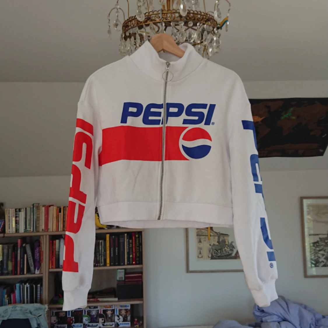 Crop top från hm, tryckt med Pepsi fram, på ärmarna och loggan bak. Dragkedja hela vägen, hög krage. Aldrig använd utom när den provades i affären, og pris ca 300 kr.