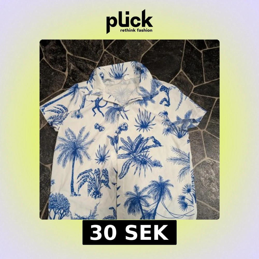 Snygg vit skjorta med korta ärmar och blått djungelinspirerat mönster med apor, fjärilar, fåglar och palmer. Skjortan har klassisk krage och knäppning framtill. Perfekt för dig som vill sticka ut med en tropisk vibe.