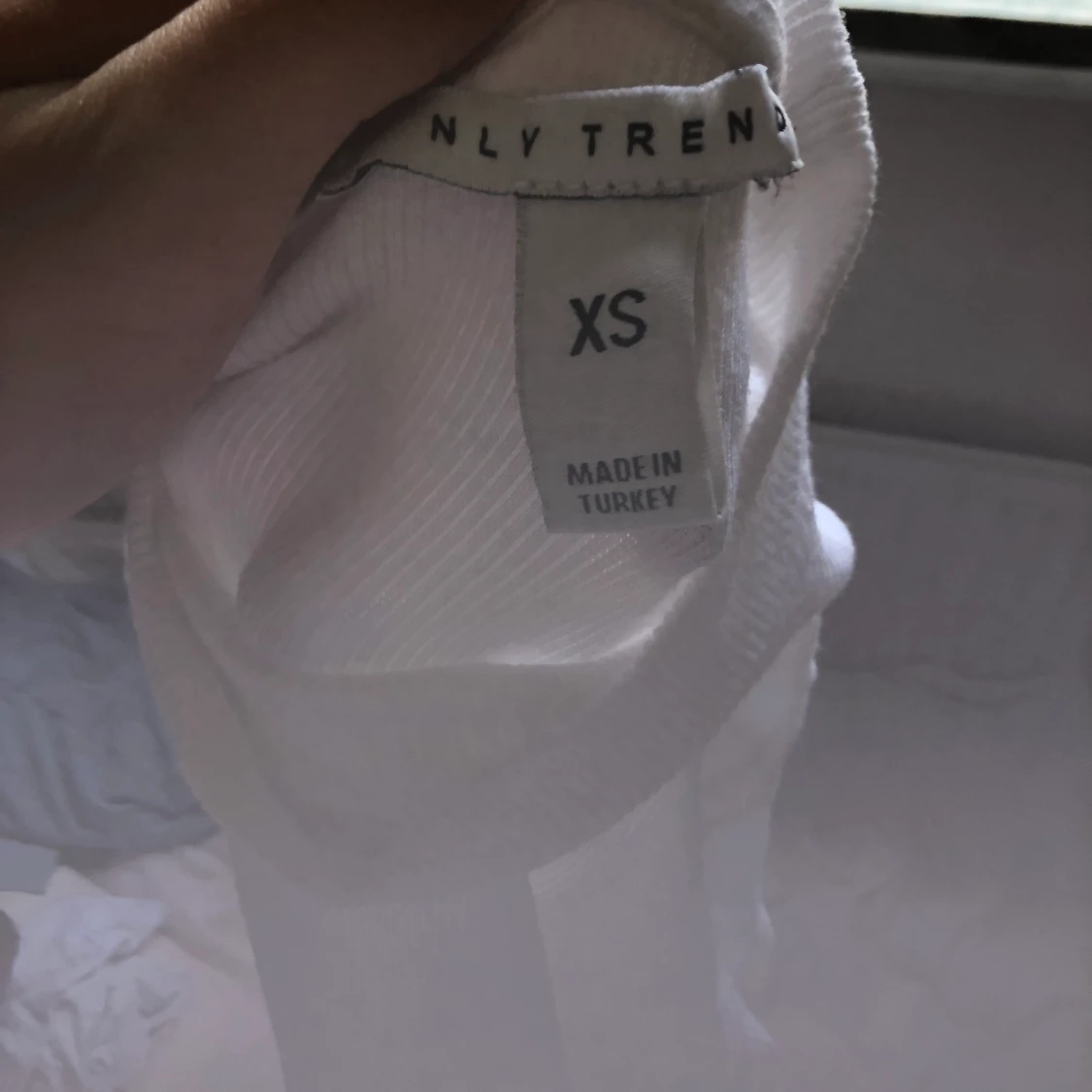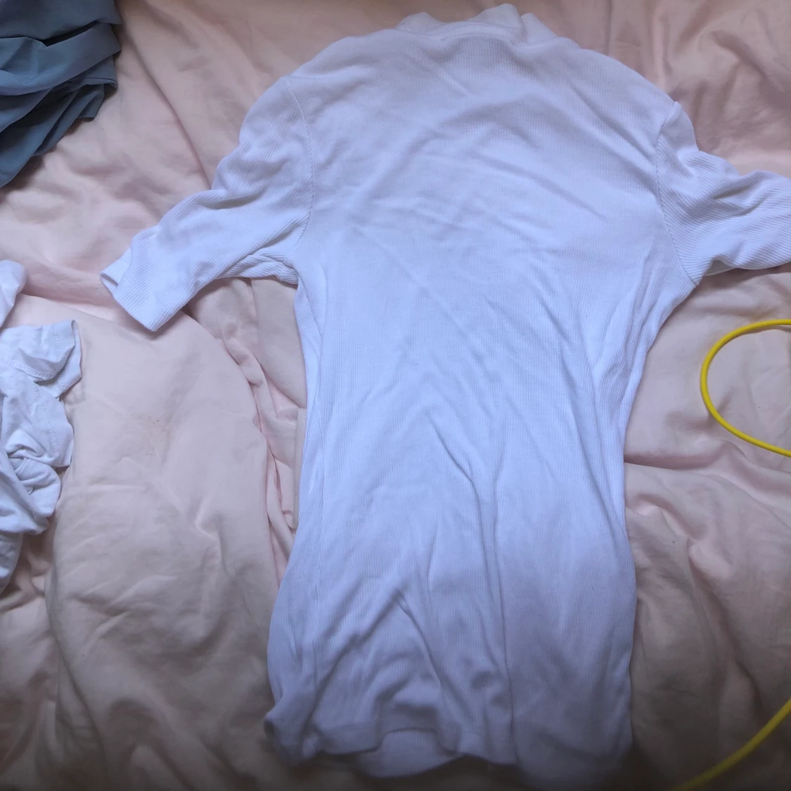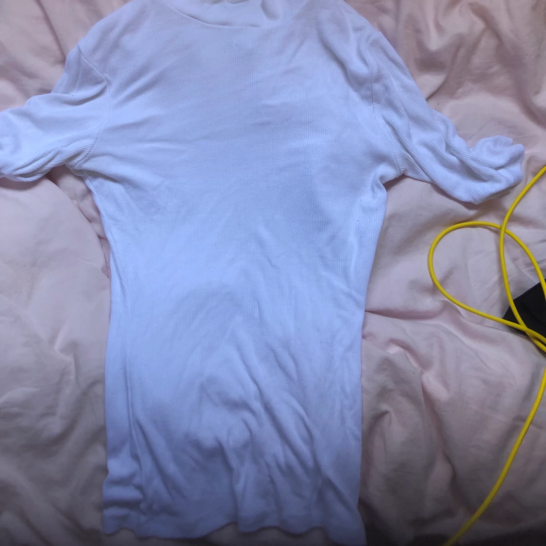 Vit småribbad tröja med en liten krage och den är kort i ärmarna. själv tycker jag den är väldigt fin men tyvärr kommer den inte till användning.