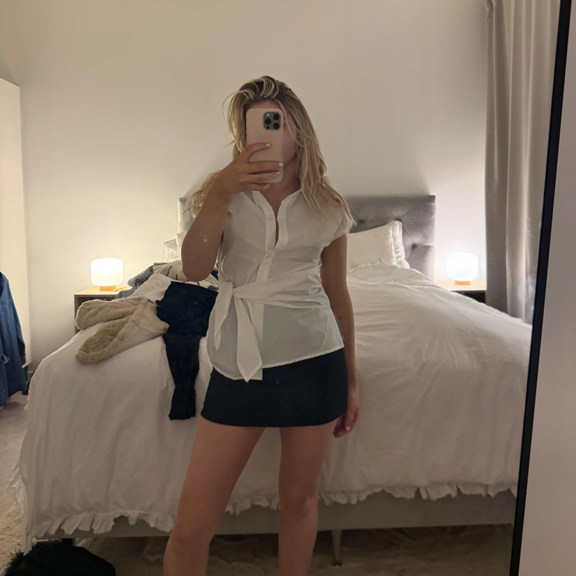 Säljer en stilren vit blus med kort ärm och snyggt knytband i midjan.