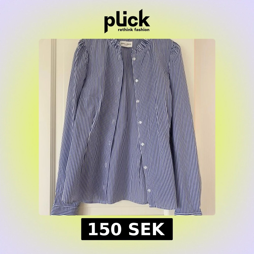 Snygg blåvit randig skjorta/blus från Holly & Whyte by Lindex i storlek 36. Den har långa ärmar, klassisk krage och knäppning framtill. Tillverkad i mjuk bomull.