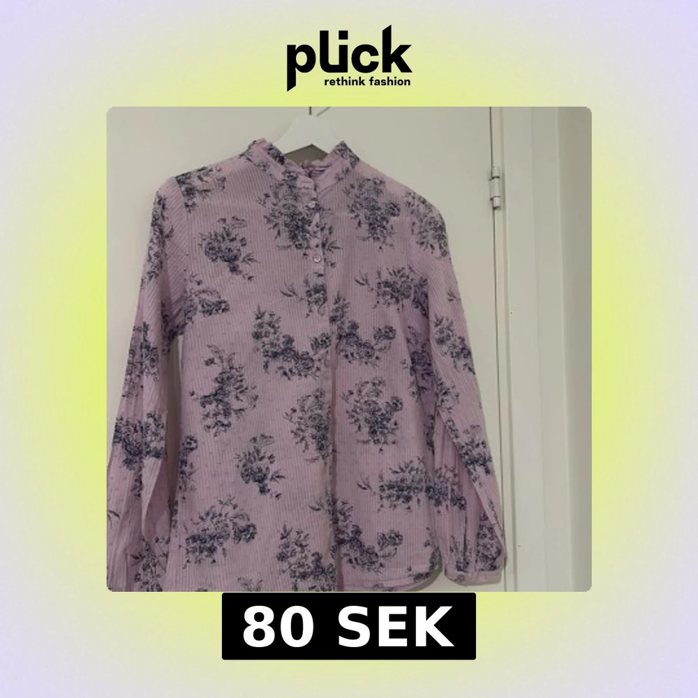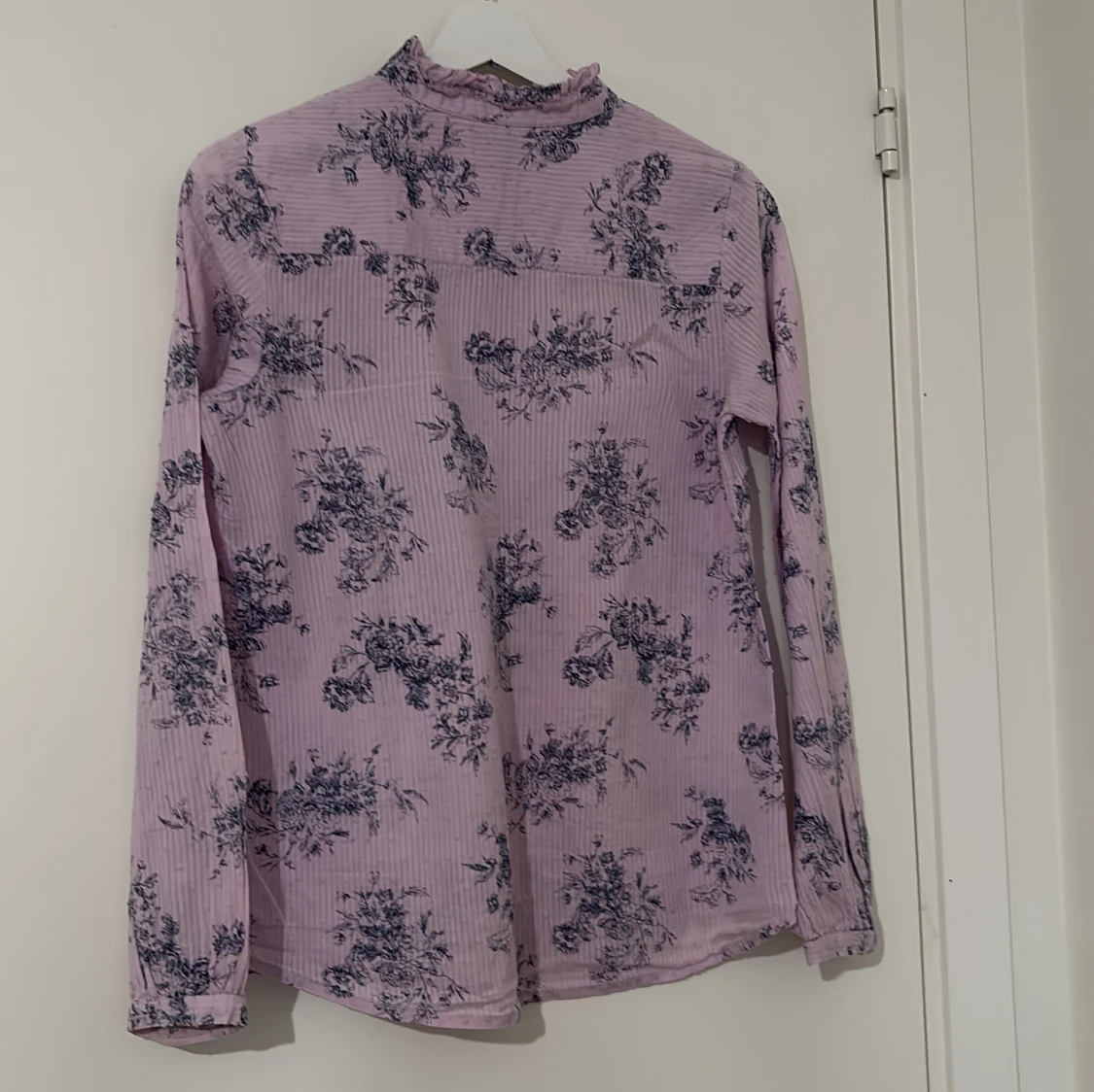 Säljer en ljuslila skjorta med mörkblå blommigt mönster och diskreta ränder. Skjortan har en söt volangkrage, knappar framtill och långa ärmar. Materialet känns lätt och luftigt, perfekt för dig som gillar romantisk stil och detaljer.