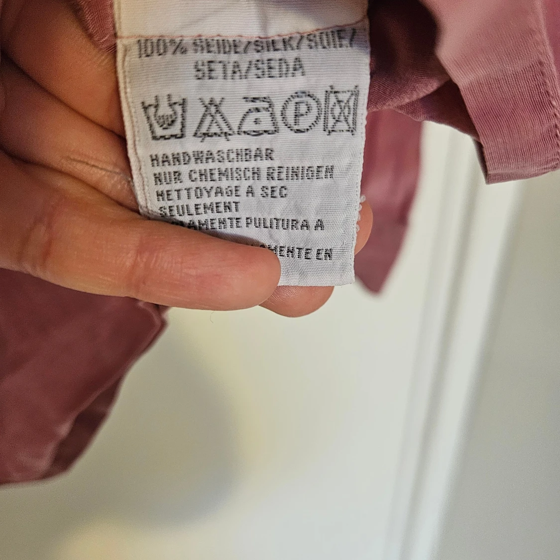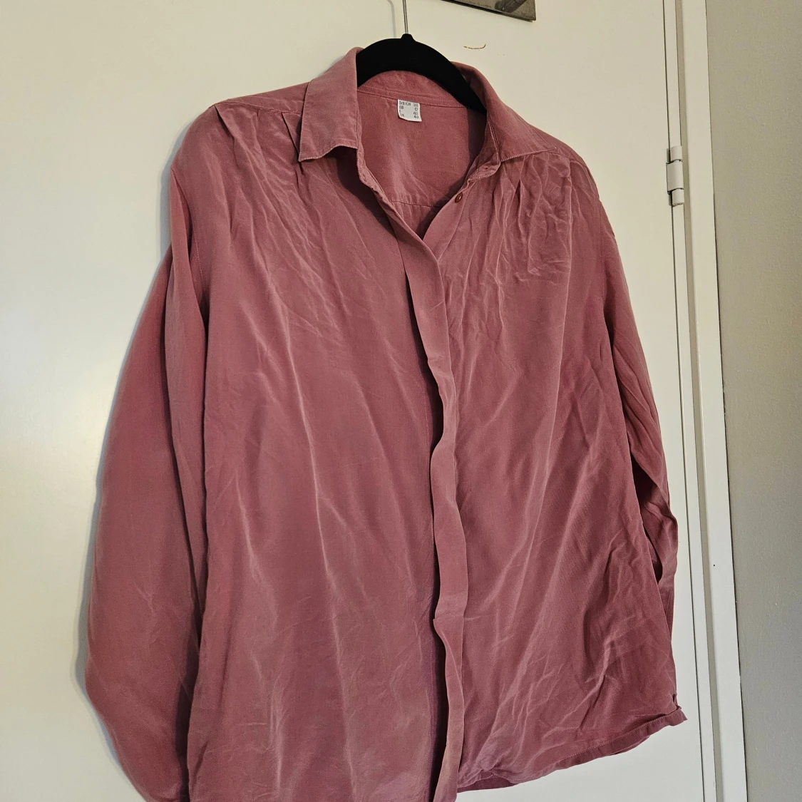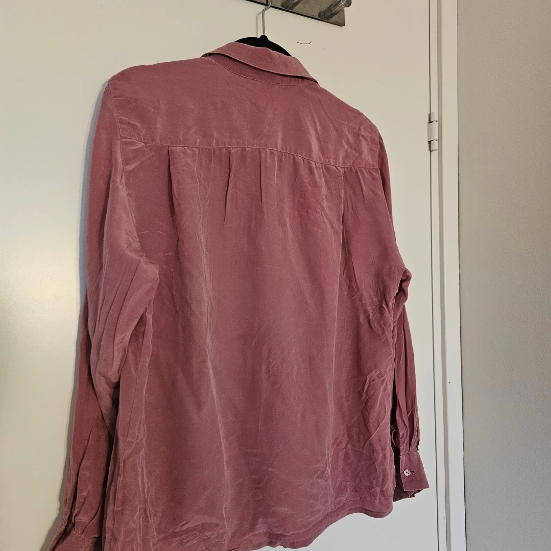 Säljer en jättefin skjorta i 100% silke i en snygg rosa färg. Skjortan har klassisk krage, långa ärmar med knapp vid ärmslut och en avslappnad passform.