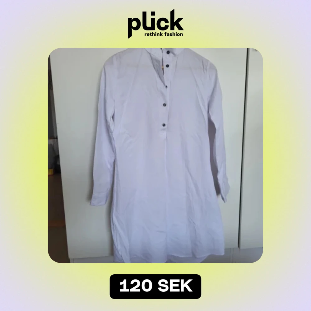 Vit skjorta med långa ärmar och knappar framtill. Den har en liten krage.