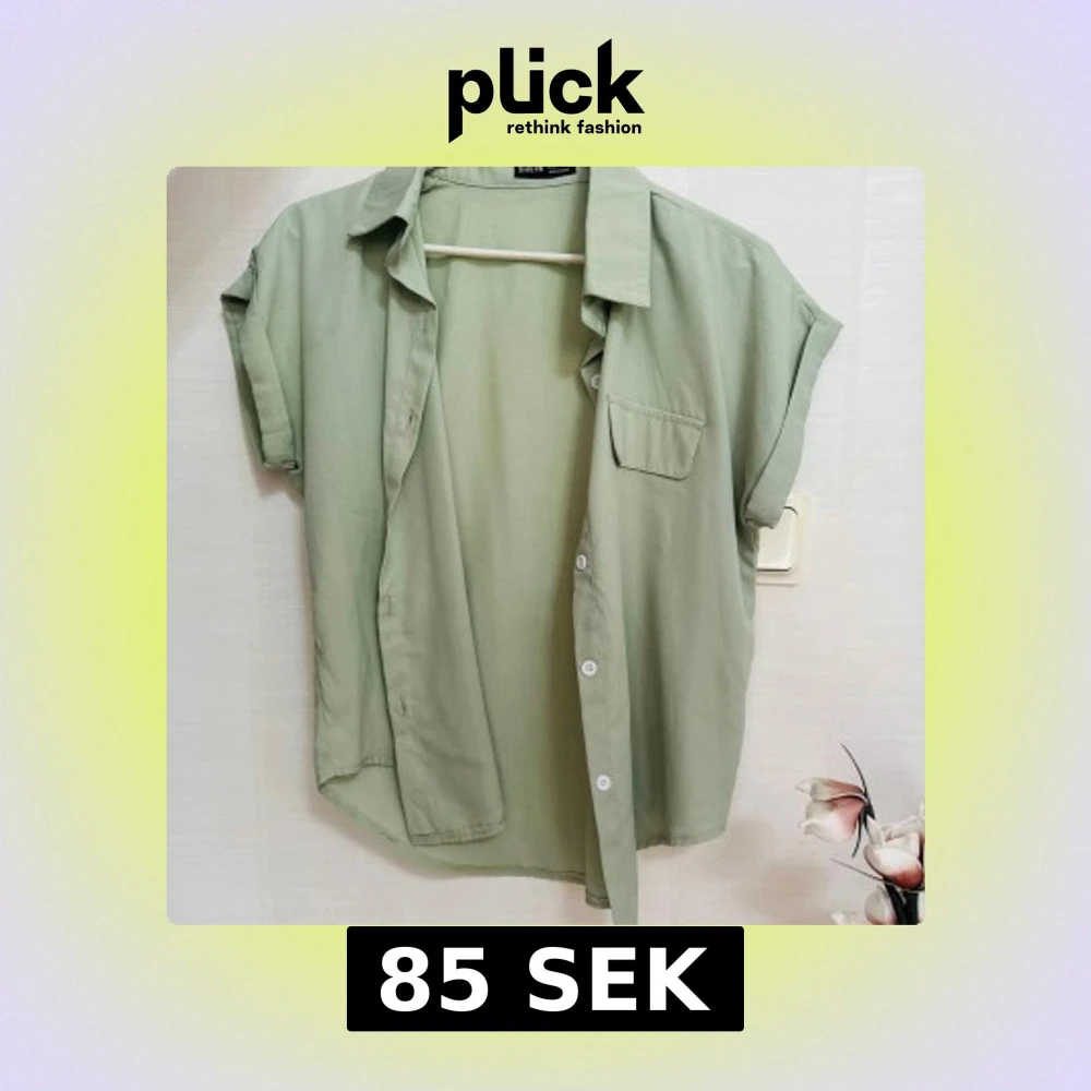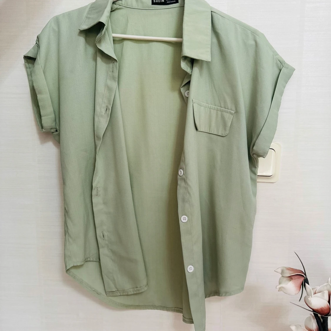 Snygg ljusgrön skjorta från Shein med korta ärmar och klassisk krage. Skjortan har knappar framtill och en bröstficka som detalj. Perfekt för en avslappnad och trendig look.