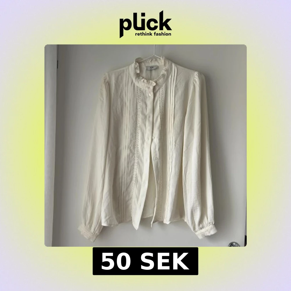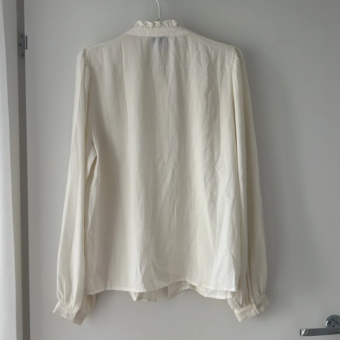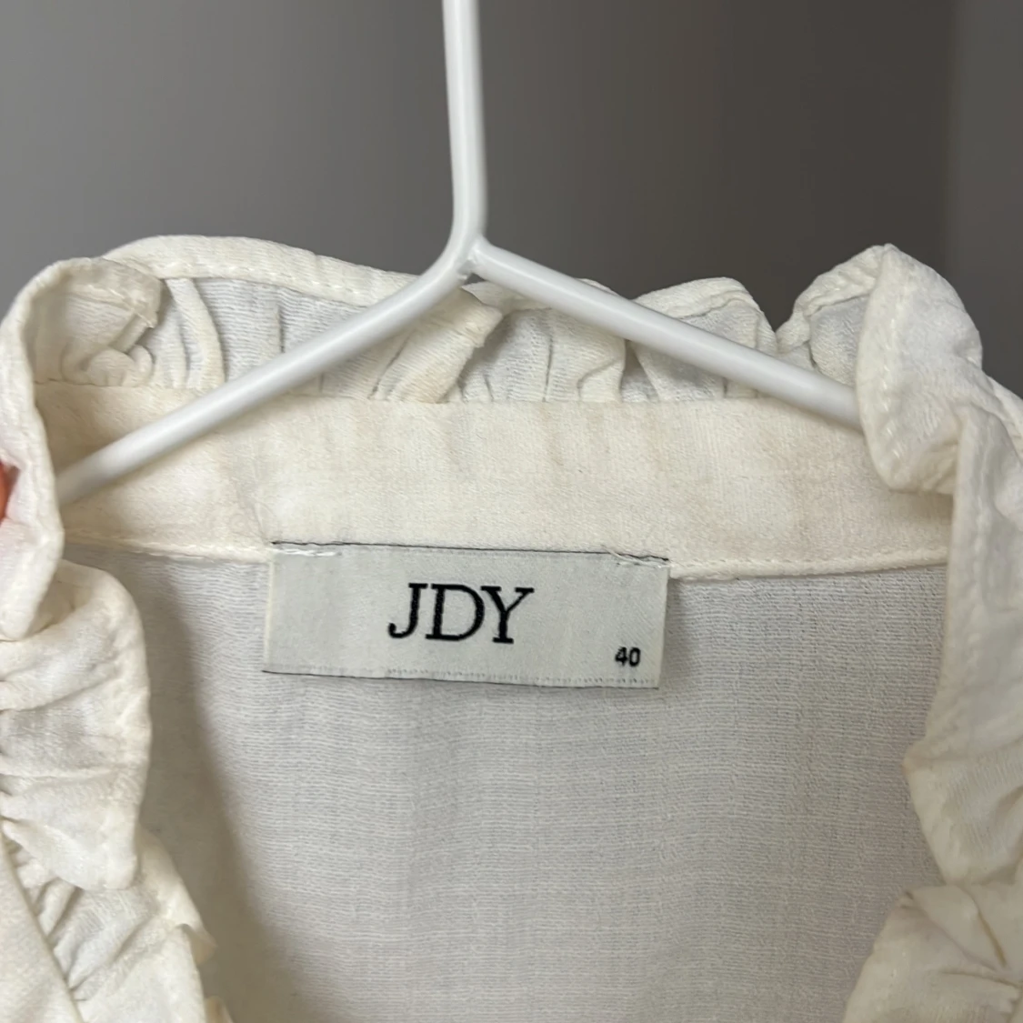 Supersöt vit blus från JDY med volangkrage och knappar framtill. Långa ärmar med spetsdetaljer vid ärmslut och längs knappslån. Luftigt material och klassisk passform, perfekt för en stilren look.