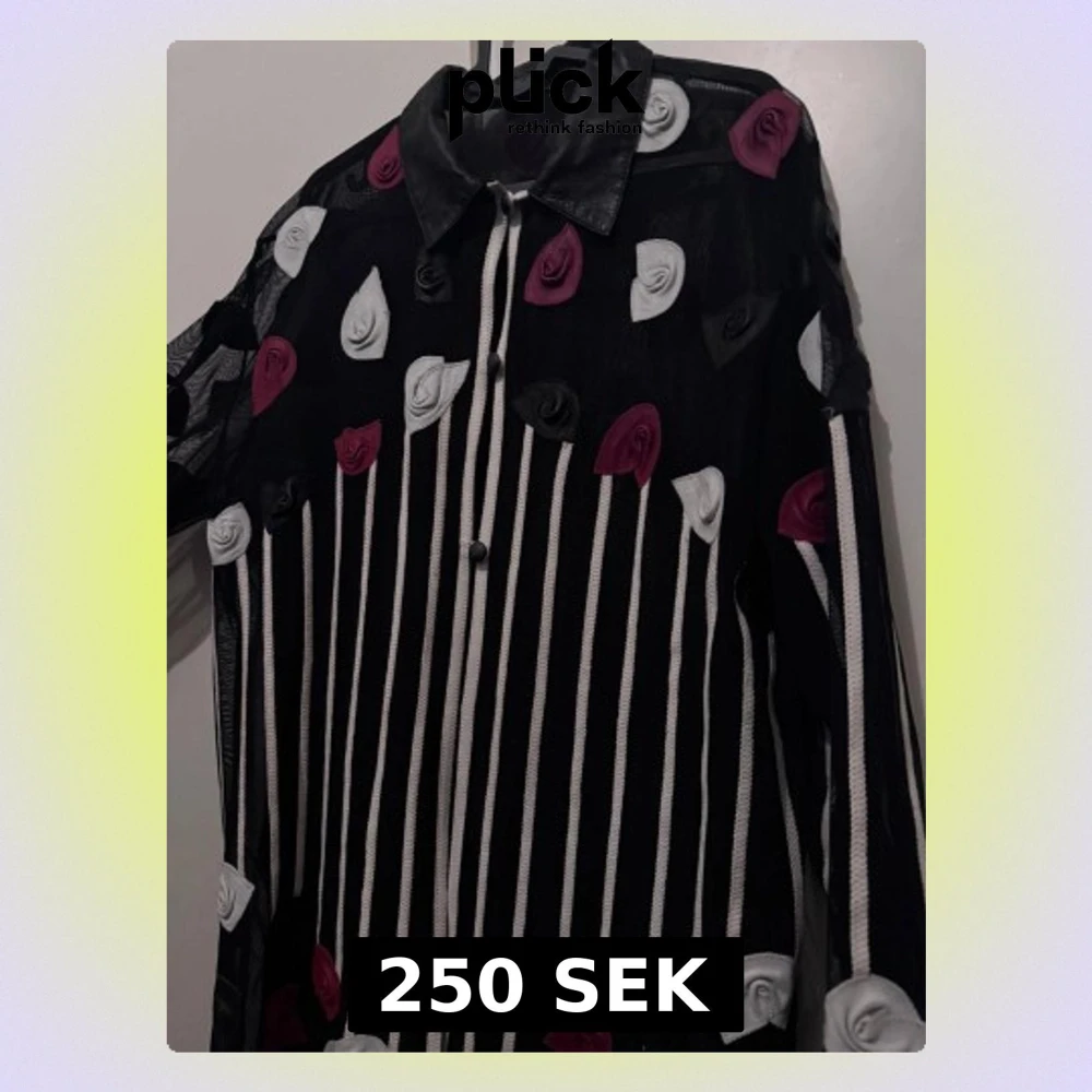 Unik svart skjorta med vita vertikala ränder och dekorativa 3D-blommor i vitt, svart och vinrött. Skjortan har klassisk krage, knäppning framtill och lång ärm. Materialet är tunt och transparent, vilket ger en cool och edgy vibe.