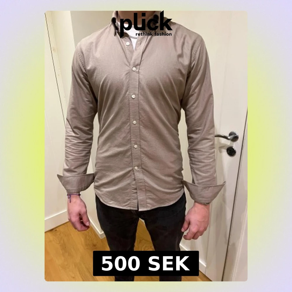 Stilren beige skjorta med klassisk krage och vita knappar hela vägen framtill. Skjortan har lång ärm med knapp vid manschetten och en normal passform som sitter snyggt på kroppen. Perfekt för dig som gillar enkel och clean stil.