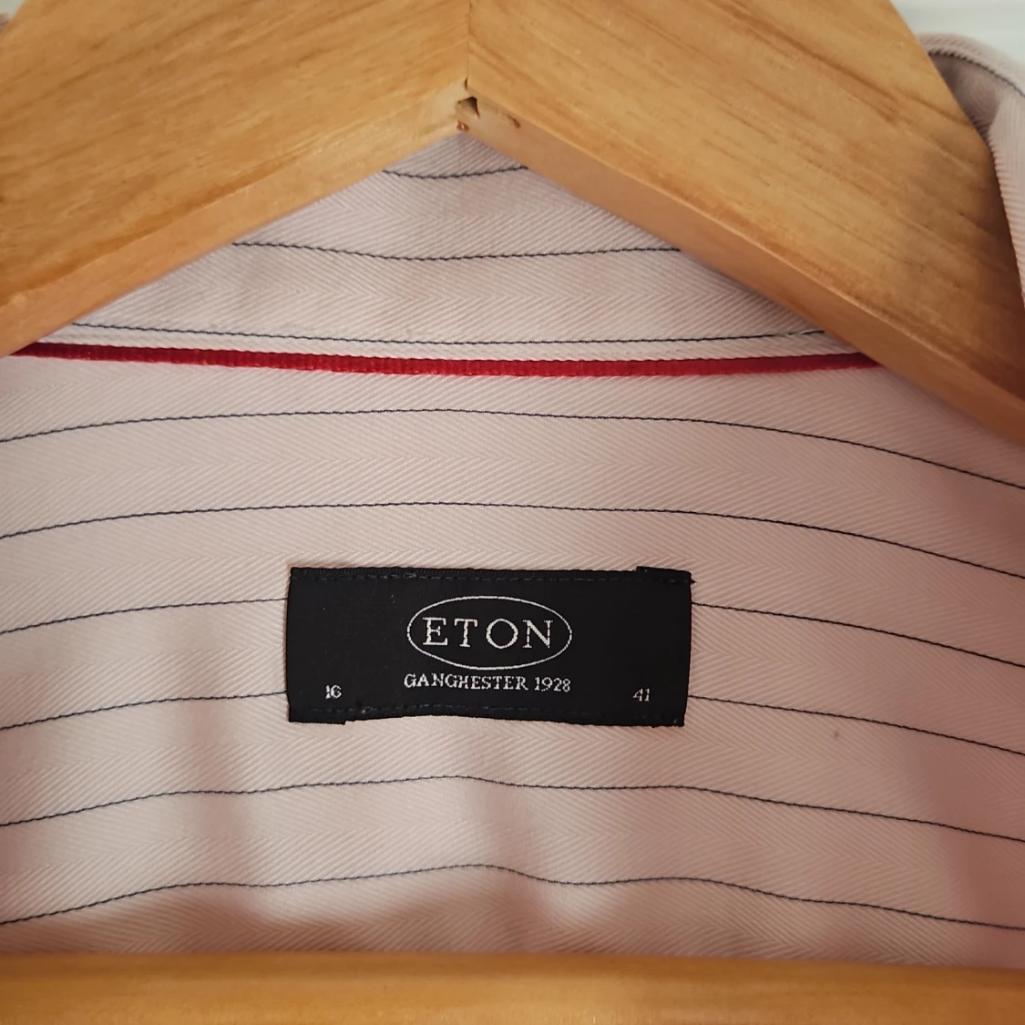 Snygg ljusrosa skjorta från Eton med tunna vertikala ränder i mörkare nyans. Klassisk krage, bröstficka och knäppning framtill. Tillverkad i bomull och passar perfekt för en clean och stilren look.