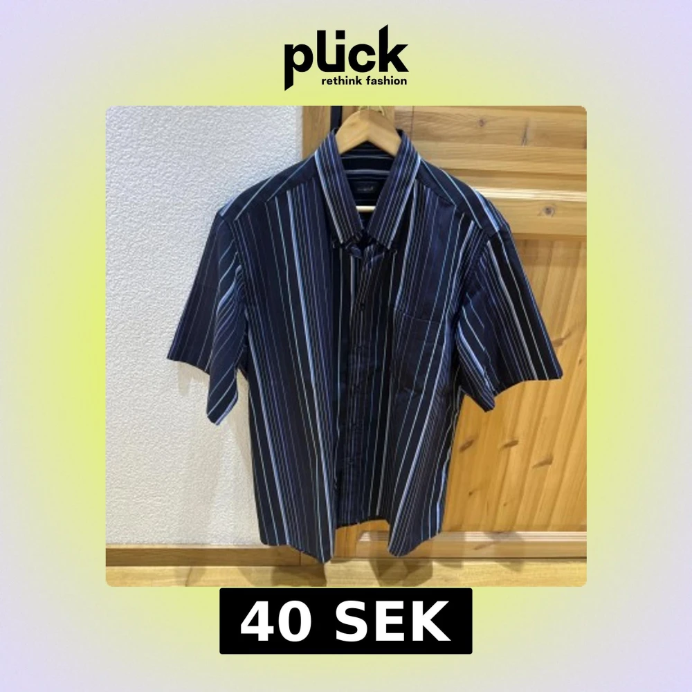Snygg mörkblå skjorta med vita och ljusblå ränder. Skjortan har korta ärmar, klassisk krage och knäppning framtill. Bröstficka på vänster sida och luftig passform.